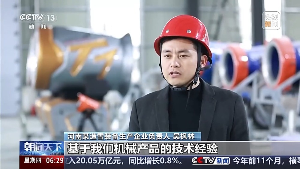 河南某造雪装备生产企业负责人 吴枫林:南方地区很多都在零上的温度,传统的造雪机只有在零下才能造雪,这个飘雪机,在零上30℃以下都可以飘雪花,每天基本上能造12立方米的雪。