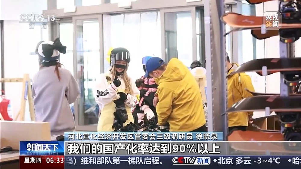 总台央视记者 杜思源:冰雪产业,从造雪制冰开始,到滑雪场的缆车、压雪车等设施,再到个人会使用的雪服雪板等等,涉及的门类繁多。推动冰雪经济高水平质量的发展,不同产线的协作、区域间的高效协同,至关重要。我现在是在河北崇礼的一家滑雪场,距离这里一个小时车程,就是当地的冰雪产业园。在京津冀地区的多个雪场,都有来自这座产业园的冰雪装备。